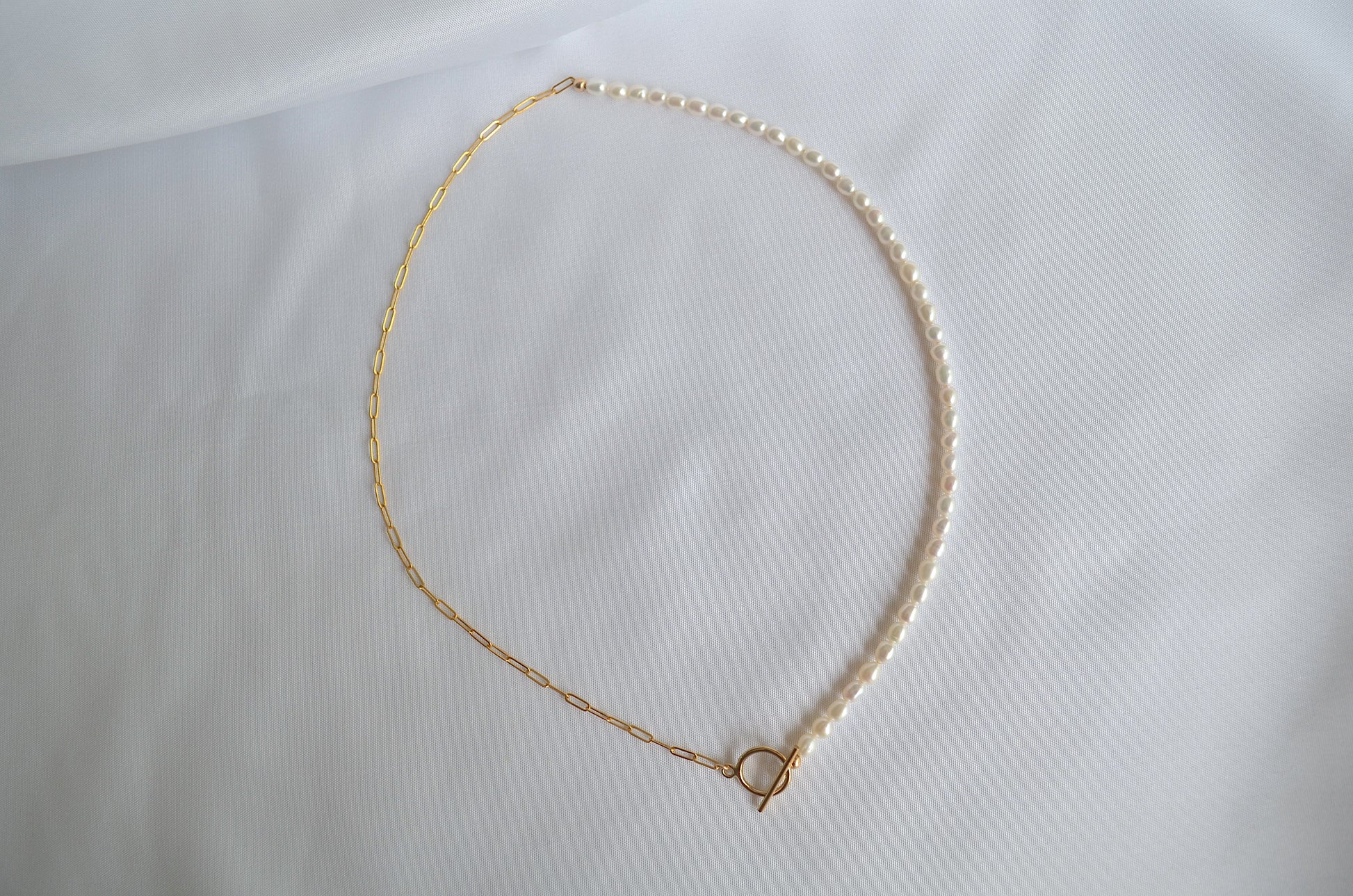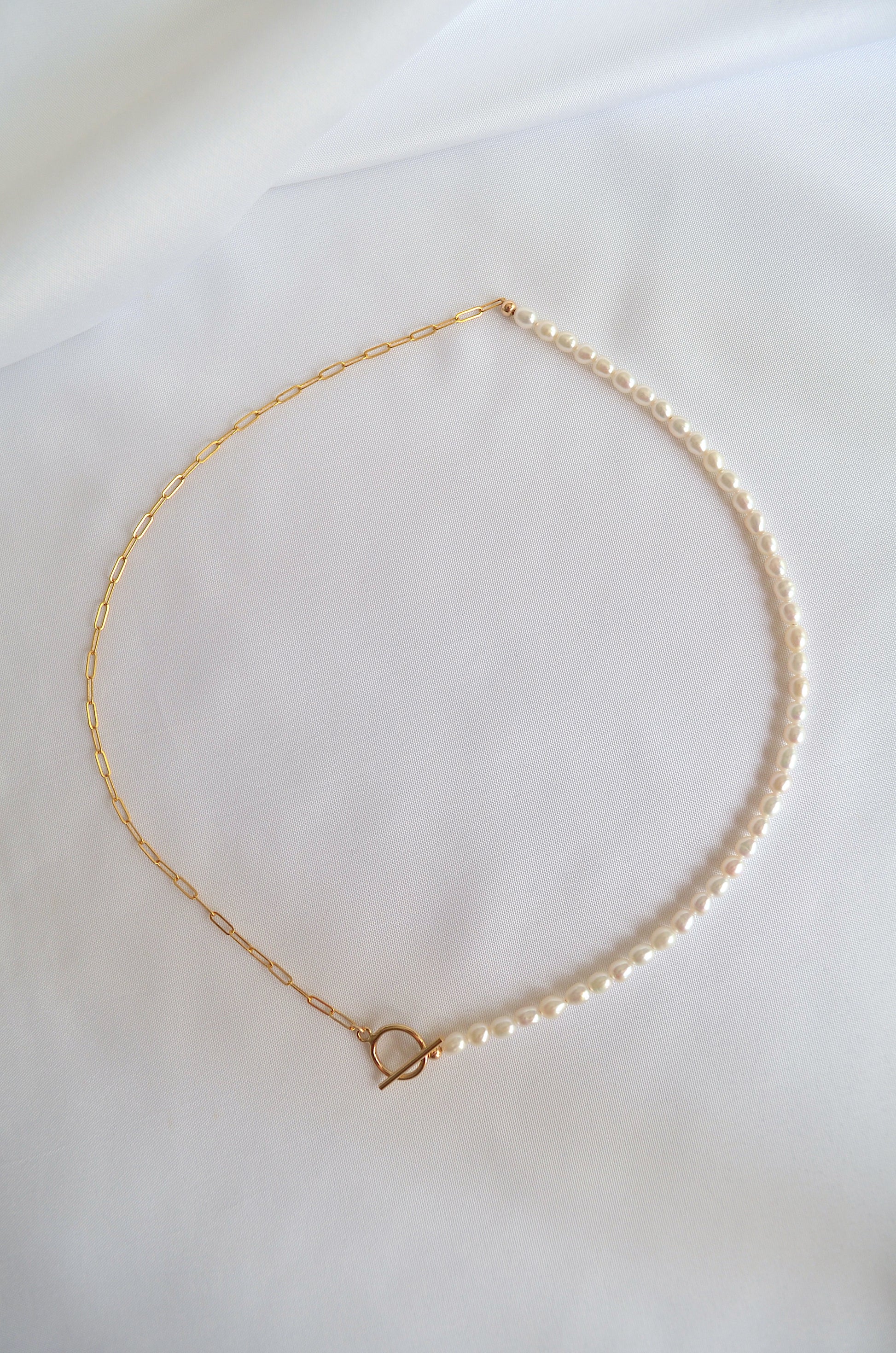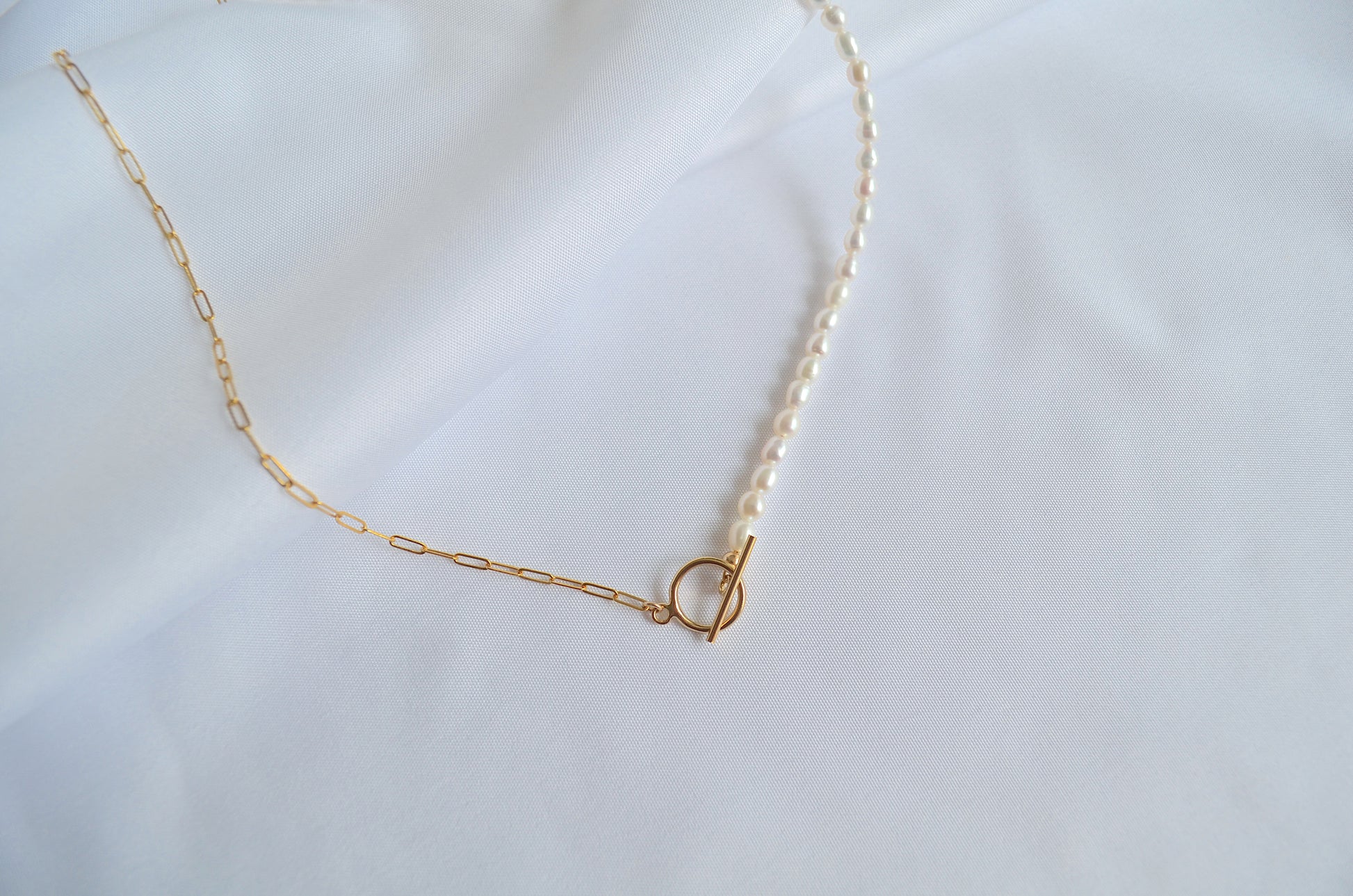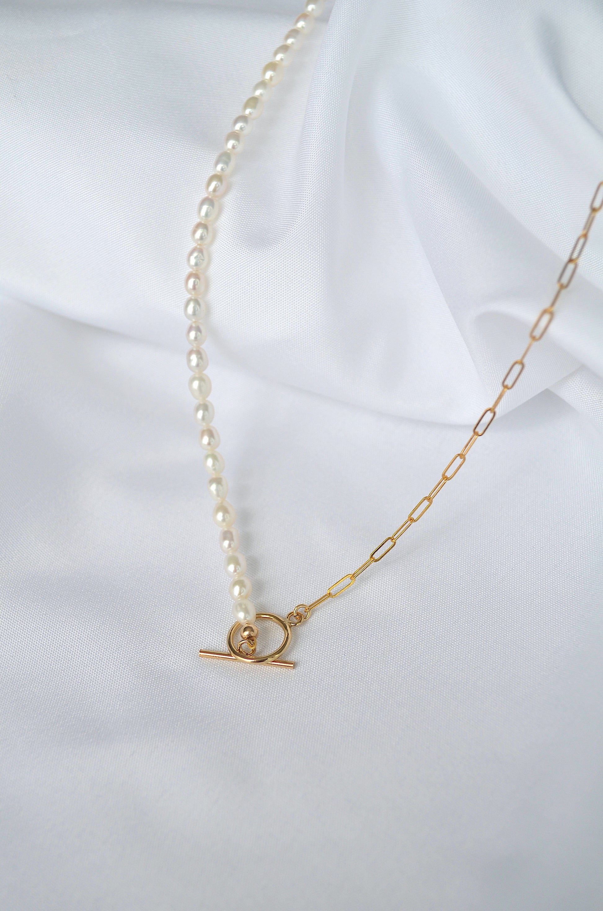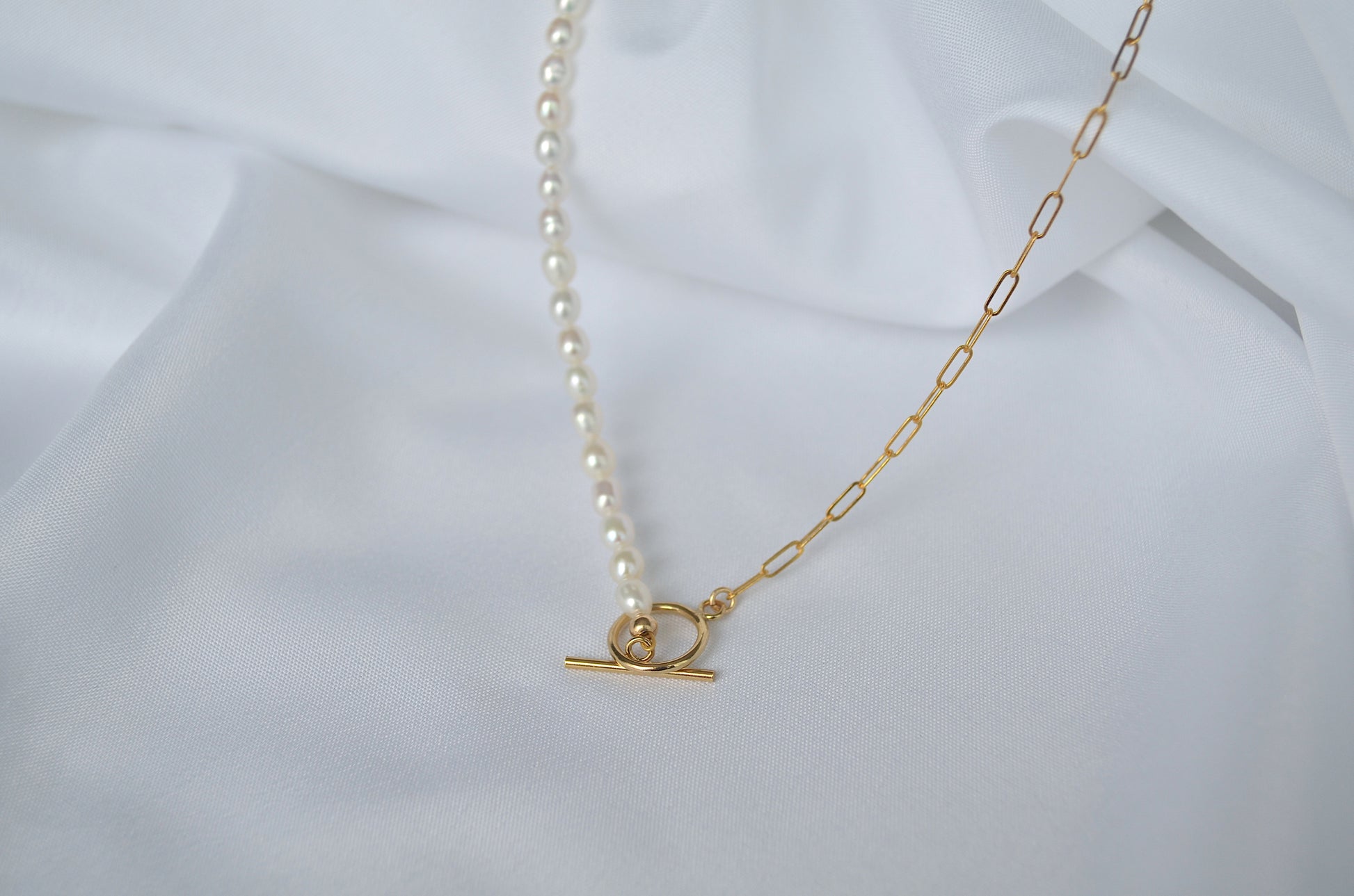 ❤️ This pearl and paperclip chain necklace features half of pearls half of gold filled chain with toggle closure which gives you multiple ways to wear it.