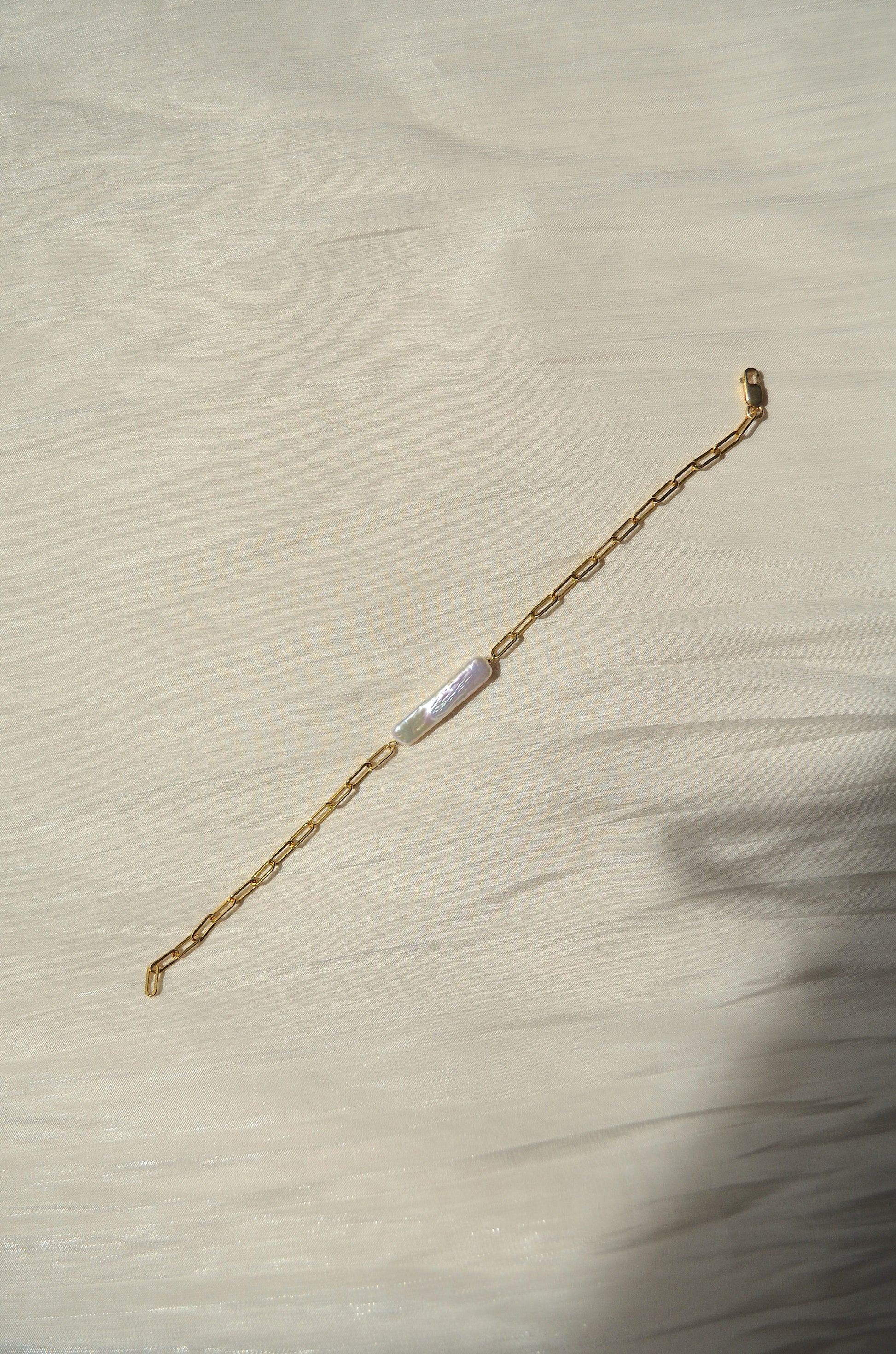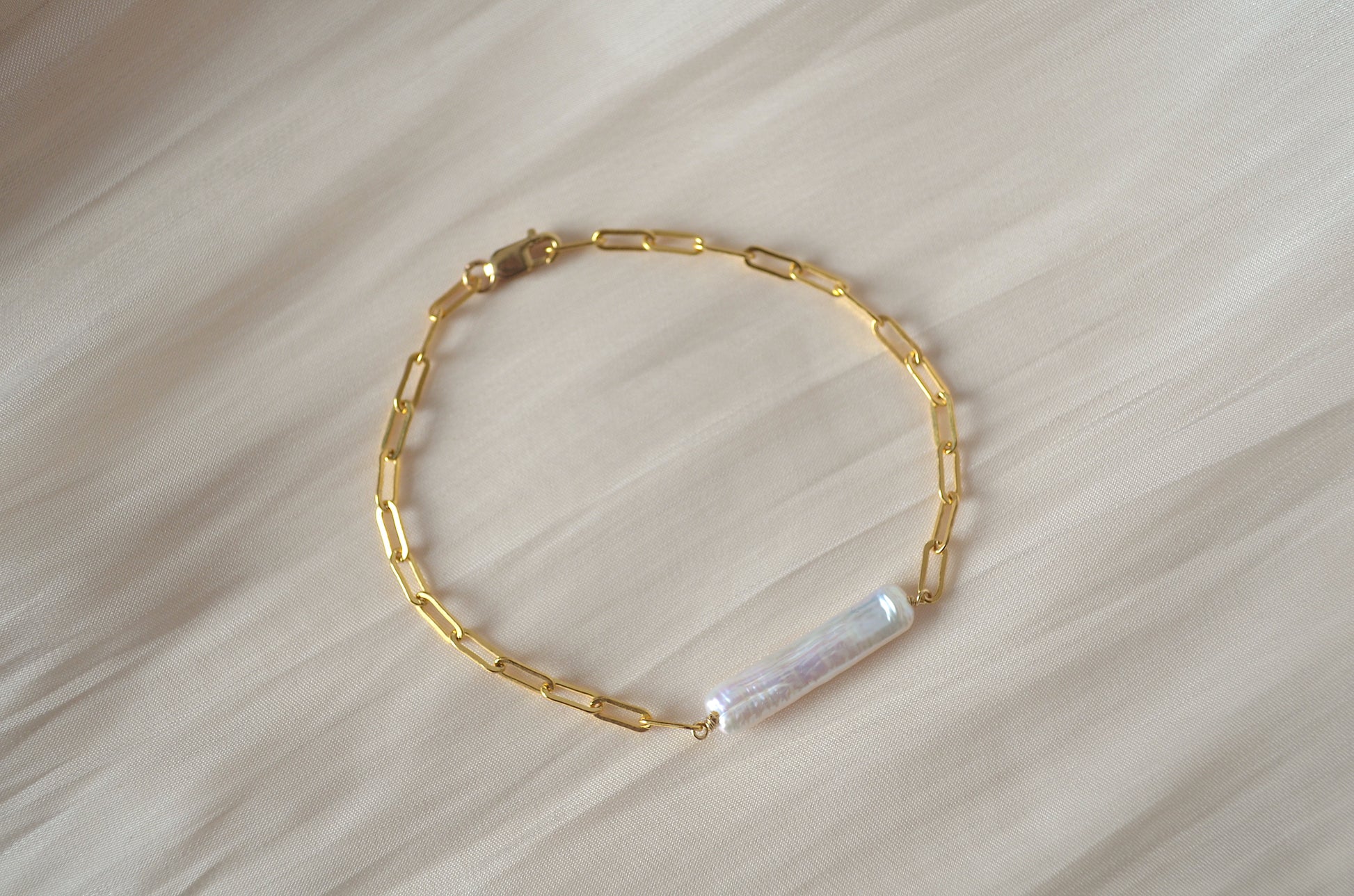 A dainty and elegant bracelet with a beautiful and rare baroque pearl and gold-filled paperclip chain. Perfect for wearing it on its own or stacking with other bracelets.