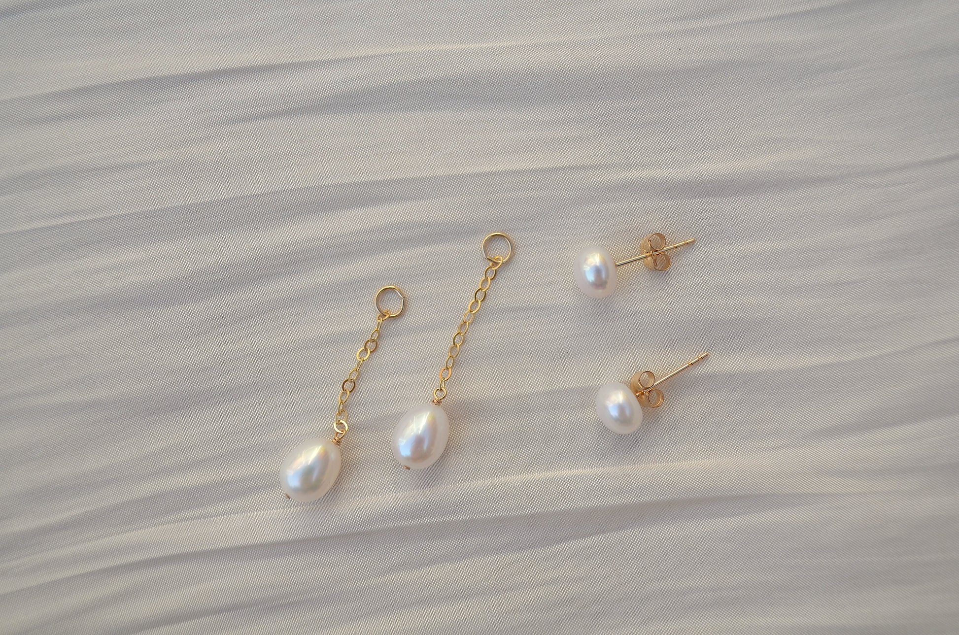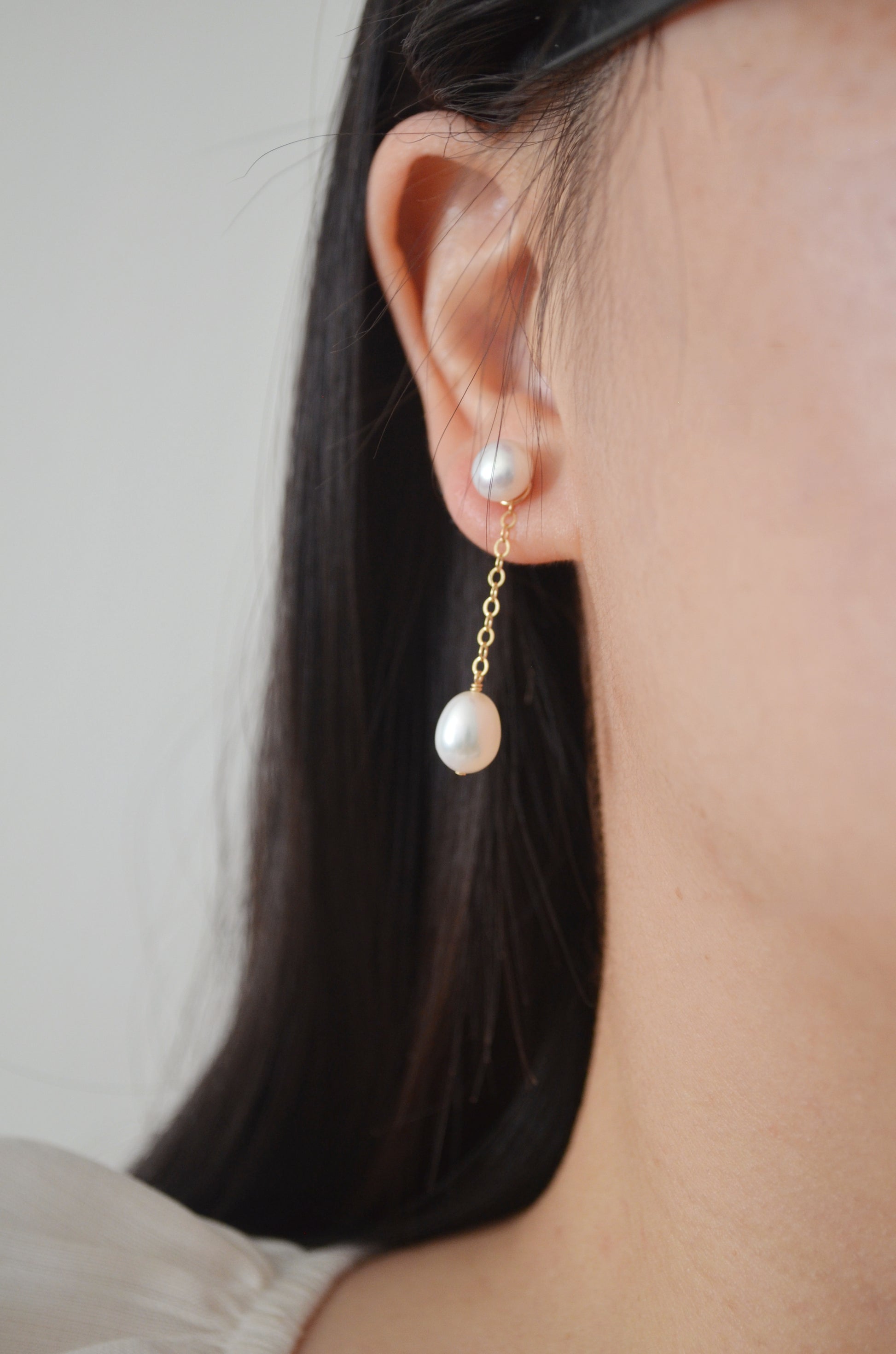 These lovely earrings are form of 14 gold filled pearl stud and dainty rice pearl jacket. You can wear the pearl stud alone for a simple and minimalist look or put on the pearl jackets for any important occasion.