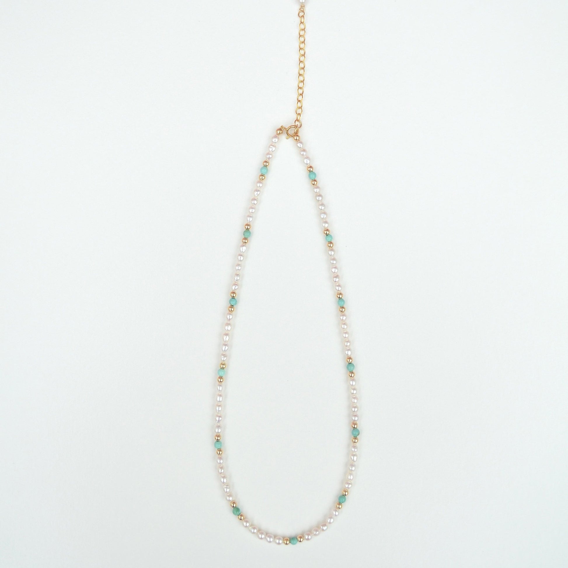 Delicate beaded necklace made with a mixture of great quality freshwater pearls in round shape, natural turquoise beads and gold filled beads. Great for summer. It is a rare find.
